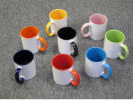 Es gibt weiße Kaffeebecher, Kaffeebecher mit farbigem Henkel und